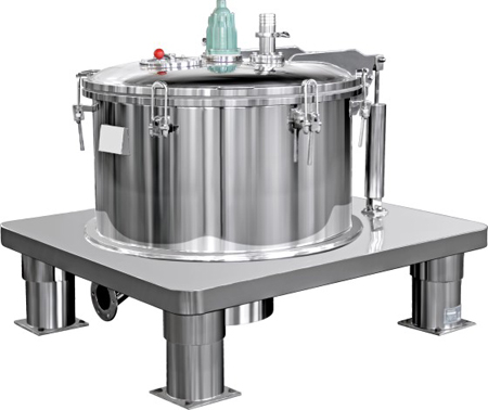 离心机均为上部卸料密闭型、间歇操作的过滤设备。物料由密闭机壳上的进料管加人转鼓,在离心力场作用下,液相穿过过滤介质排出机外,固相物截留在转鼓内,停机后打开机盖从上部卸料。具有运转平稳、操作简便和进料、洗涤、脱水在密闭状态下进行等特点。