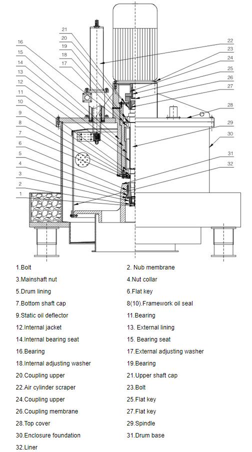 1. Structure: The shell is equipped with feed pipe, washing pipe, observation mirror, exhaust port, inspection hole, lighting hole; closed structure, drum, shell, flip cover and other parts are made of stainless steel (SUS304). The machine base is cast, and the surface is lined with stainless steel. The drum, the inner and outer surfaces of the shell, and the surface of the exposed parts of the machine are all polished.